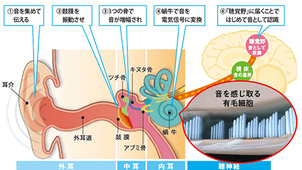 電気の信号は神経を通じて脳に送られ、脳が「音が聞こえる」と判断するのです。